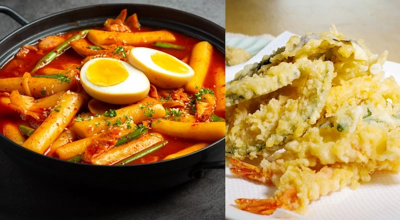 Tteokbokki served with fried dumplings, mixed tempura, and 2 canned drinks