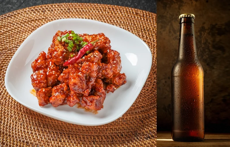 Korean popcorn chicken glazed in sweet and spicy sauce + 2 bottles of beer