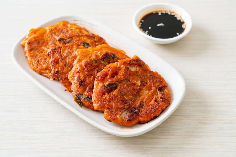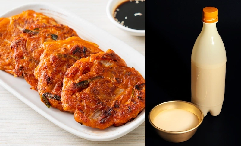 Assorted Korean pancakes served with a bottle of traditional Korean rice wine